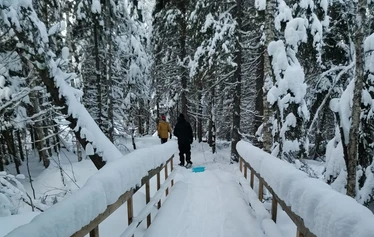A guided hike through frozen landscapes. An evening snowshoe trip that leads you through a silent sleeping forest in the light of headlamps. Snowshoeing is a fun and easy way to explore the snowy arctic forest that feels even more magical by night. Remember to wear warm winter boots! Warm drinks are served during the excursion.